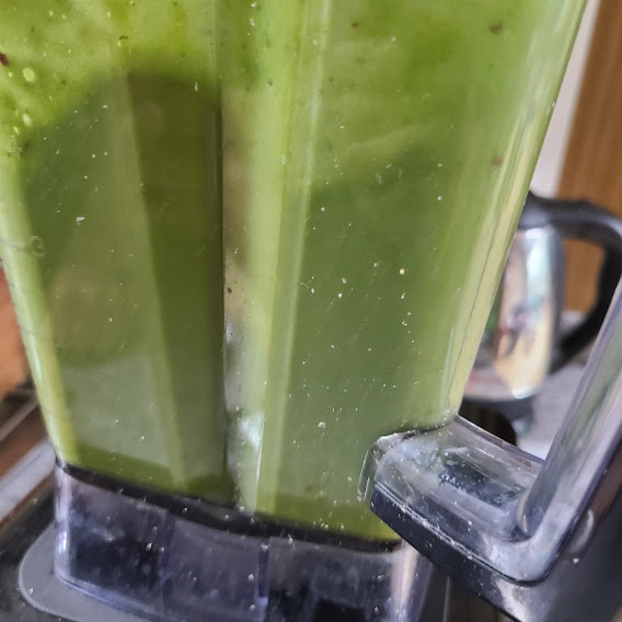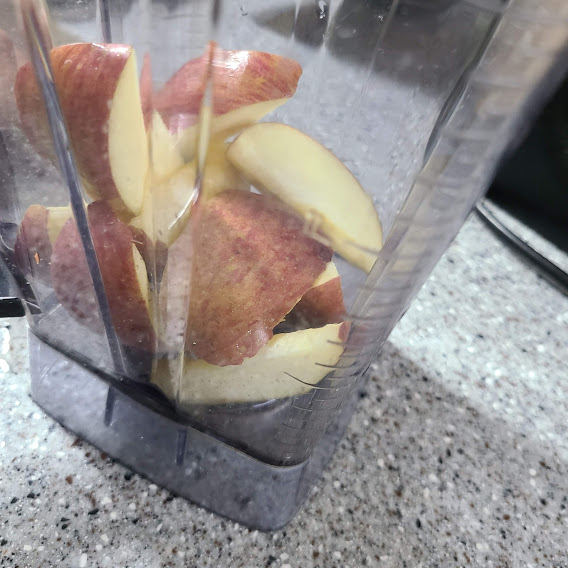믹서기에 케일과 사과, 물을 넣어서 갈아 줍니다.