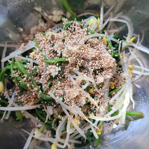 1차 밑 간을 한 콩나물과 시금치를 골고루 잘 섞어줍니다.