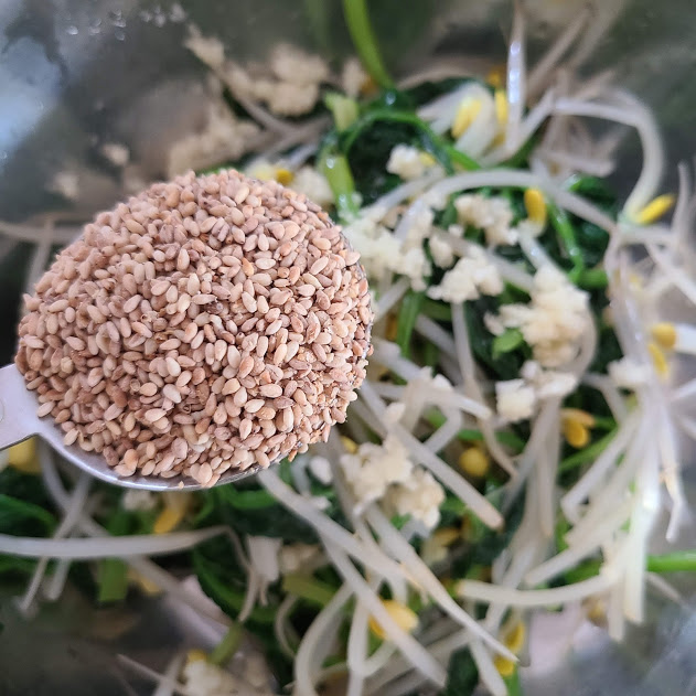 함초소금 조금, 간장 1작은술, 다진 마늘 1작은술, 참기름 1큰술, 깨소금 1큰술