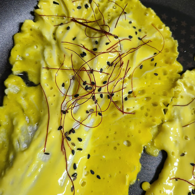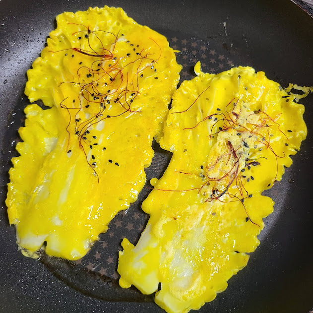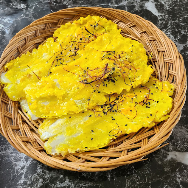 배추, 부침가루, 튀김가루, 물, 식용유, 검정깨, 실고추, 치자, 소금 조금,