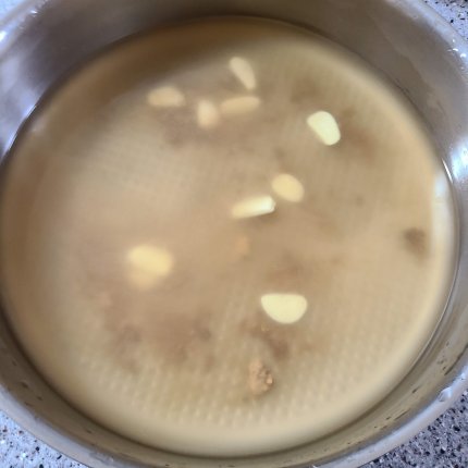 찜 된장 1큰술, 마늘 3개 썰어 넣고 소주 1/2컵 넣어서 풀어 줍니다.