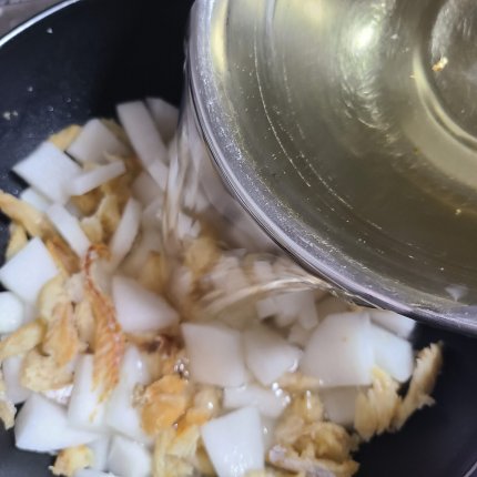 황태채 80g 무 1/3, 대파 1, 홍고추 1, 청양고추 1, 계란 2, 육수 1L(다시마 육수)