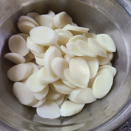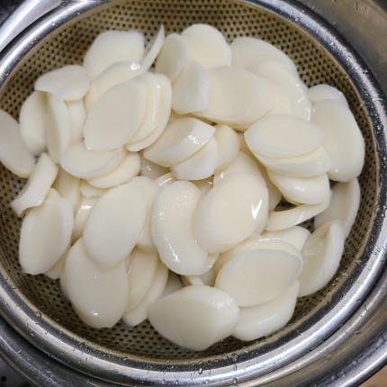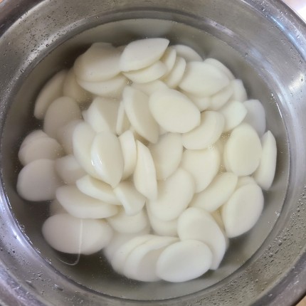 떡국떡은 물에 담가 불려 줍니다.
