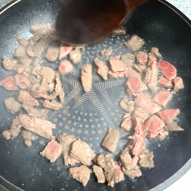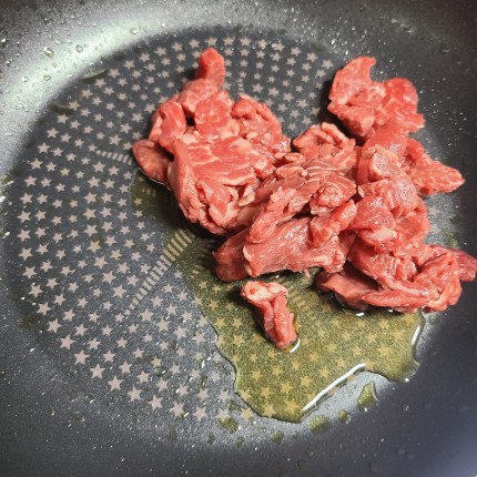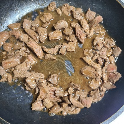 참기름 1큰술 두르고 소고기 볶아줍니다.