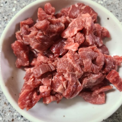 국물이 끓어오르면 볶아서 준비한 소고기 넣고 넣고 끓여줍니다.