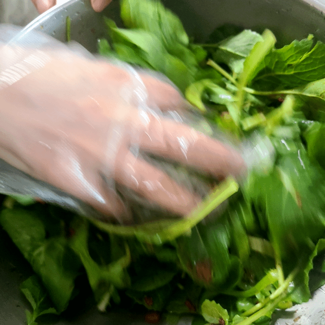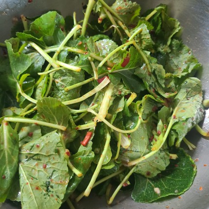 겨울초에 양념장 붓고 조물조물 무쳐줍니다.
