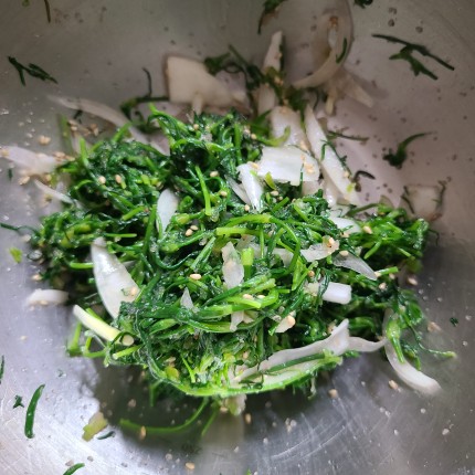 양파, 명란젓을 넣고 조물조물 무쳐줍니다.