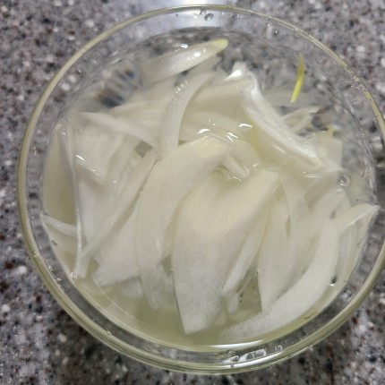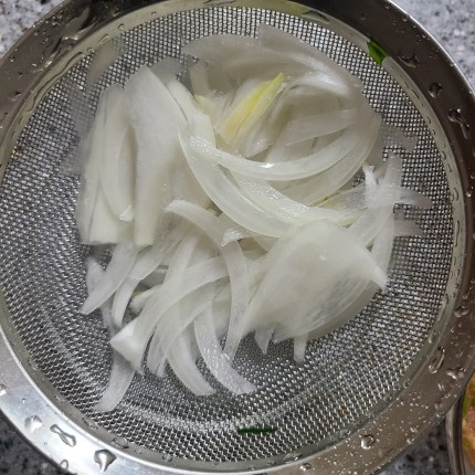 양파 조금 잘게 채 썰어서 물에 담가 매운맛을 제거합니다.