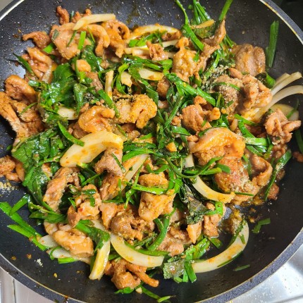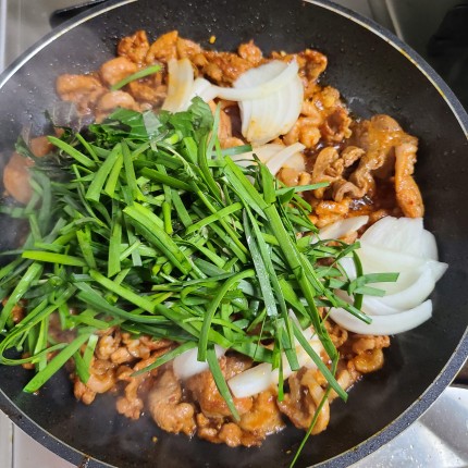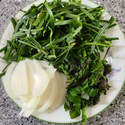 준비한 야채(부추 깻잎 양파)를 넣어 줍니다.