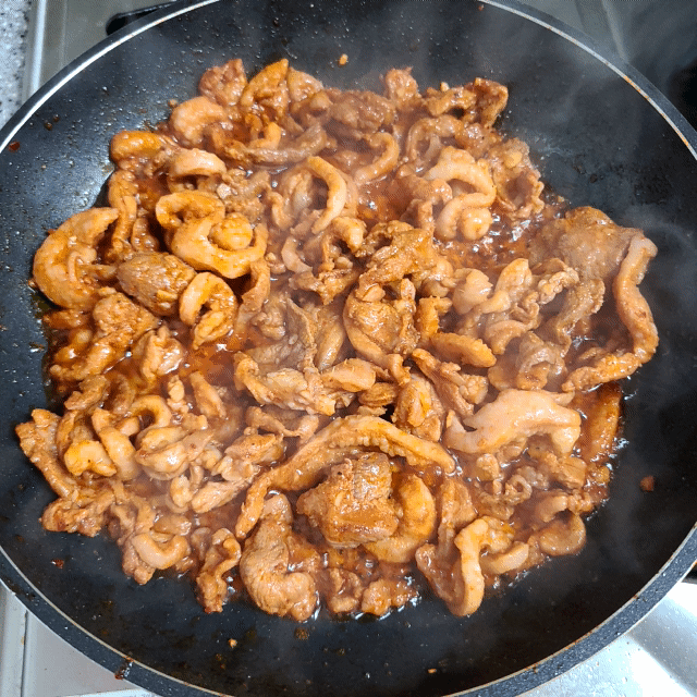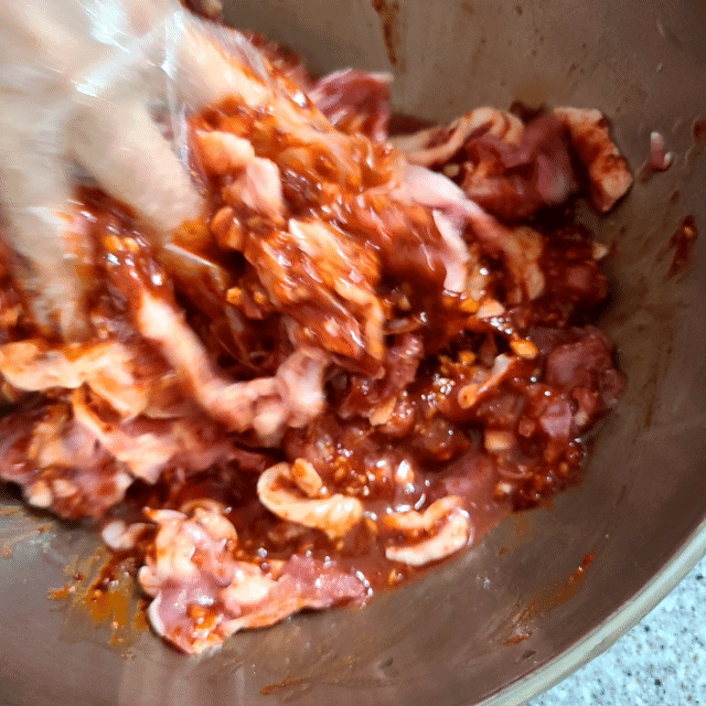 오리고기에 양념장을 붓고 잘 섞어 줍니다.
