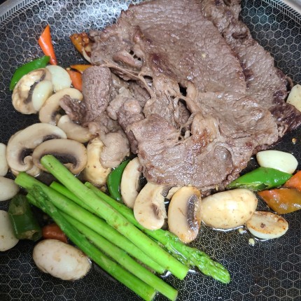 준비한 야채 양송이버섯, 아스파라거스도 넣어 구워 줍니다.