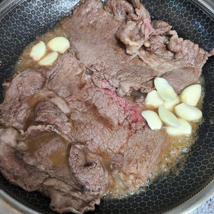 고기가 어느 정도 익으면 마늘 편 썰어 넣고