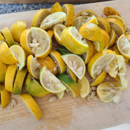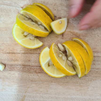 탱자를 깨끗이 씻어서 반달 모양으로 썰어줍니다.