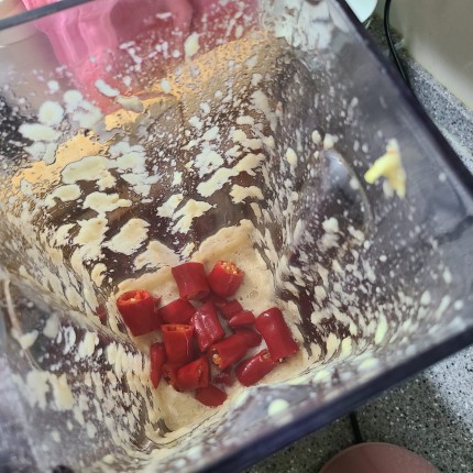 홍고추 3개, 마늘 5알 넣고 살짝 갈아 줍니다.